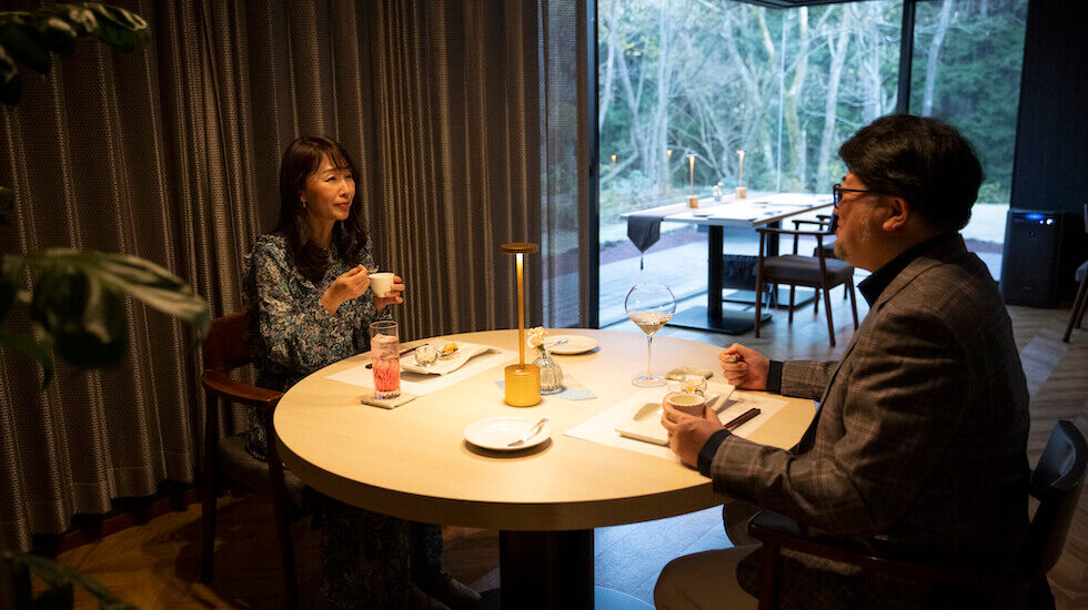 記念日で訪れるゲストも多い、伊豆高原に佇む全7室だけのリゾートホテル「ラグジュアリーホテル 風の薫 MORI Premier」。国立公園の自然に囲まれた、レンガ調の重厚な外観が目印です。おすすめの客室は、露天風呂付きのメゾネット。窓から伊豆高原の緑を眺めながら、プライベートな滞在を満喫できます。宿で提供されるドリンクは、追加料金なしのオールインクルーシブです。食事の後は、ロビーラウンジでアルコールを楽しむのもよいでしょう。サーバーから注ぐビール・シャンパン・ワインなどのほか、ひと口サイズのおつまみや軽食も用意されています。