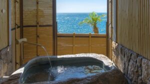 西伊豆で人気の絶景スポット・旅人岬の目の前に建つ温泉宿「BEAUTY&SPA RESORT IZU 頬杖の刻」。部屋にいながらにして、旅人岬とほぼ同じ景色を一望できます。また、温泉宿の宿泊者しか入れないビーチがあり、静かな環境で磯遊びや散策を楽しめますよ。土肥海水浴場・小土肥海水浴場はともに温泉宿から車で5分以内なので、海水浴シーズンの宿泊もおすすめです。全ての客室のテラスに温泉露天風呂を備えており、駿河湾を眺めながら温泉を満喫できます。中でも、海に沈んでいく夕陽は絶景です。内風呂も付いているため、雨の日も安心。別棟の貸切露天風呂は、予約不要・無料で何度でも入れます。