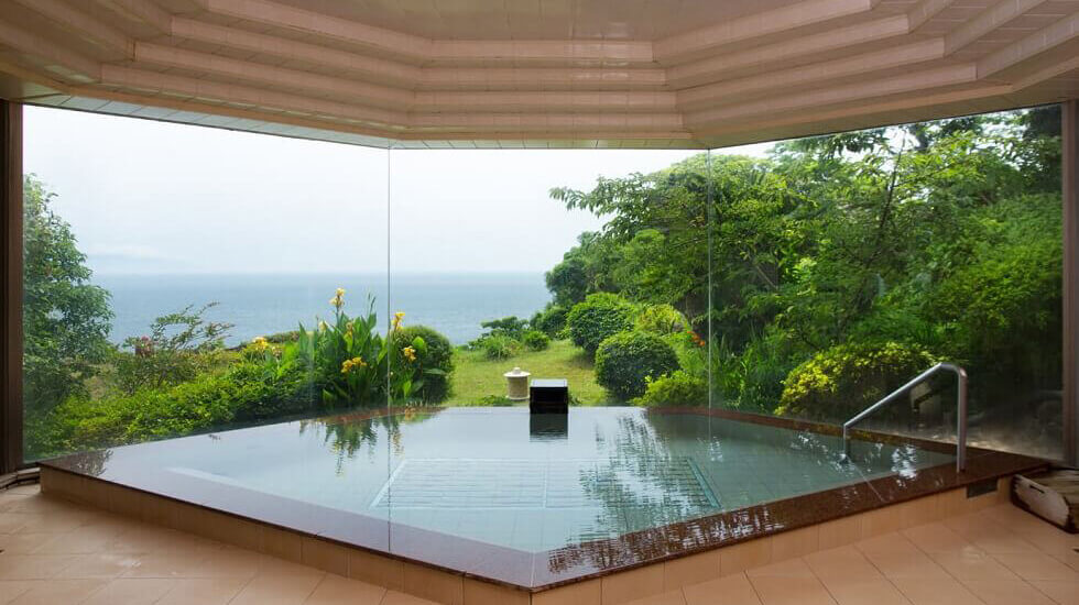 【静岡/東伊豆・北川温泉】北川温泉の高台に建つ、八角形の建物が特徴的な温泉リゾート。海岸沿いの高台に建つため、ほとんどの部屋がオーシャンビュー! 水平線から満月が昇ると、姿を現す名月・ムーンロードを客室や露天風呂から望むことができます。桜の季節には花見風呂も。温泉と併せて楽しみたいエステも、海を眺めながら。アロマの香りに包まれて癒しの時を過ごせます。宿では、チェックイン後に味わえるパンケーキやアロマオイルの貸し出しなど、女性にうれしいおもてなしも。夕食は、フレンチ・鉄板焼き・懐石料理の3種類からチョイス。金目鯛や伊勢海老などの海鮮や地元の山海の幸をたっぷり味わえますよ。