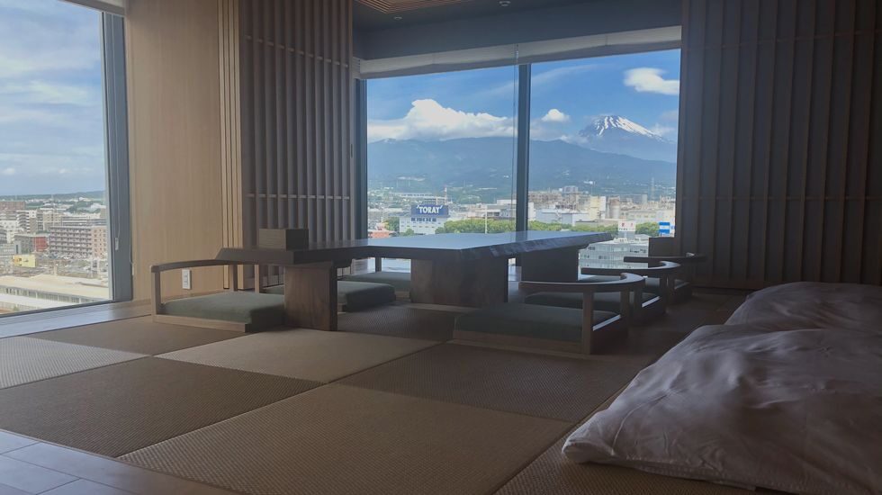 【静岡/三島】新幹線が停車する「三島駅」から徒歩約1分。全客室の窓を2メートル以上と大きく取っており、見晴らしが最高。ツインルームをはじめ、畳が一面に配された64.2平米のファミリールーム、高層階のビューバス付のセミスイートなど、出張や家族旅行、恋人との特別な滞在など、多彩な客室が用意されています。最上階に位置する露天風呂付展望温浴施設「富士の湯」からは、美しい富士山や箱根山麗、駿河湾を眺めながら、絶景の湯浴みを体感できます。朝食では、炉端で炙った鯵の干物や地元野菜が揃ったサラダコーナーをはじめ、地元名物の三島コロッケ、生わさび丼などが味わえる日もありますよ。