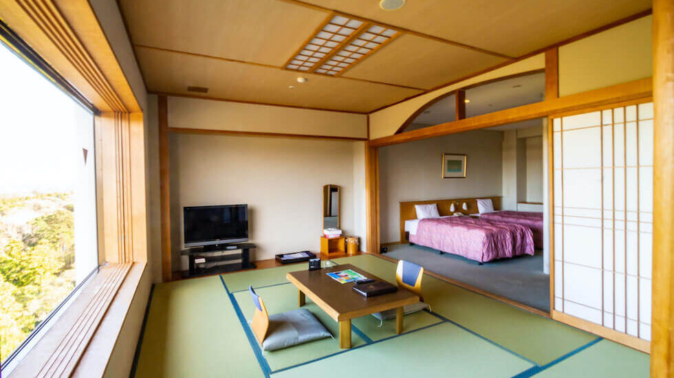 【静岡/伊東】「別邸 そらのうえ」は、赤ちゃん連れに特化した「陽」という専用客室があり、子連れファミリーにおすすめの宿です。1歳未満の赤ちゃん1名まで宿泊可能で、畳敷きの広々とした和洋室にクイーンサイズのローベッドと赤ちゃん用布団が完備されています。