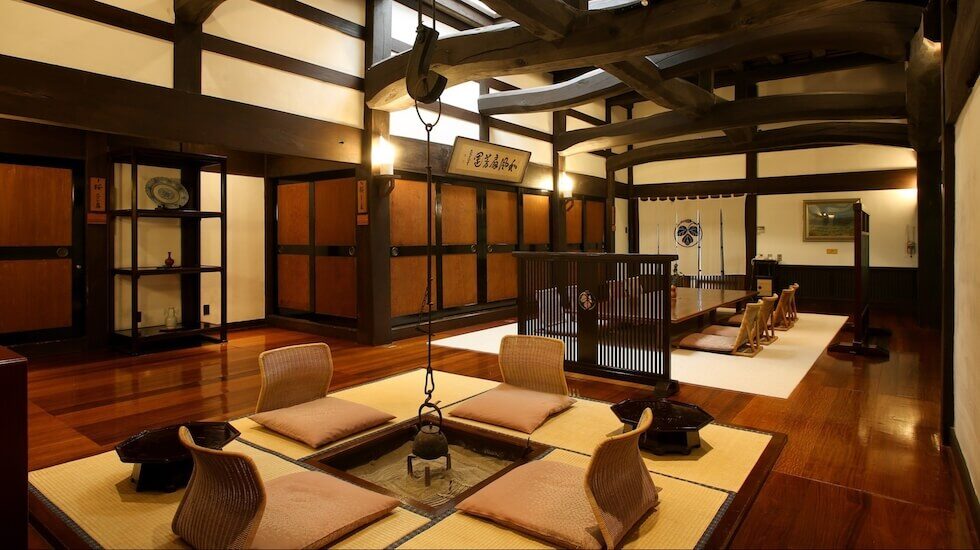 【静岡/袋井】古民家7軒分を移築し、1978年にオープンした「ヤマハリゾート葛城北の丸」。その立派さに思わず立ち止まってしまう入り口の門は、「郭松門」。静岡県菊川市に残る代官屋敷の長屋門をモデルに、スケールを2倍にして建築されました。玄関の立派な柱や梁、そして老松をバーカウンターやラウンジの机に使用したり、宴会場の大きな引き戸にはもう手に入らないスギの一枚板を使用したり。古くから残る材質をひとつ一つ大切に再利用しています。建物の屋根に使われているのは遠州瓦も美しく、宴会場や客室にも木の温もりにあふれています。まるで武家屋敷のような圧倒的なスケールの宿で、江戸時代にタイムスリップしたような気分を味わってみては?