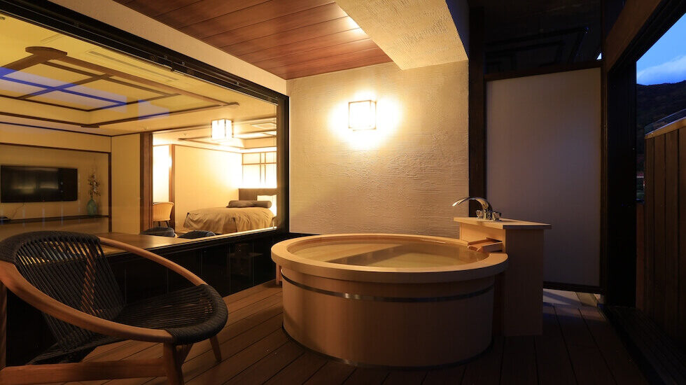 約2000坪の広大な敷地に建つ「ふたりとわに 縁」は、10棟のみの離れからなる土肥の温泉宿です。全棟が駿河湾に面して並び建ち、晴れた日は富士山の雄大な姿も眺められます。全ての客室に露天風呂付きのテラスが付いていて、大切な人と水入らずで過ごせるのも人気のポイント。広々とした檜の湯舟で、名湯・土肥温泉を存分に満喫できます。こちらの温泉宿は客室のほかにも2つの眺望テラスがあり、特に西伊豆・土肥ならではの夕景は見逃せません。食事は和食とフレンチが融合した創作懐石で、駿河湾の魚介をはじめ地元の山の幸がたっぷり使われています。メインディッシュは、ライブ感あふれるキッチンで焼き上げる黒毛和牛。もし小腹がすいたら、夜食におにぎりとお椀を客室まで届けてもらえます。