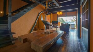 6000坪にも及ぶ森に囲まれた「森の入り江の離れ宿 無雙庵枇杷(むそうあんびわ)」。土肥の小高い山の中腹に位置し、駿河湾の眺めが見事な温泉宿です。客室は全て古民家風の離れになっていて、まるでふる里に帰ってきたかのような気分を味わえます。こちらの温泉は、加温・加水・循環を一切していません。貴重な湯を客室の露天風呂のほか、無料の貸切露天風呂でも堪能できます。貸切露天風呂は最上階にあり、地元牧場の牛乳とミネラルウォーターが用意されているのもうれしいポイント。食事は、客室ごとに専用スペースで提供されます。囲炉裏と掘りごたつを備えた食事処は、風情も眺望も抜群。旬の魚や野菜をふんだんに使った、オリジナルの伊豆懐石料理を土肥の温泉宿で楽しんでください。