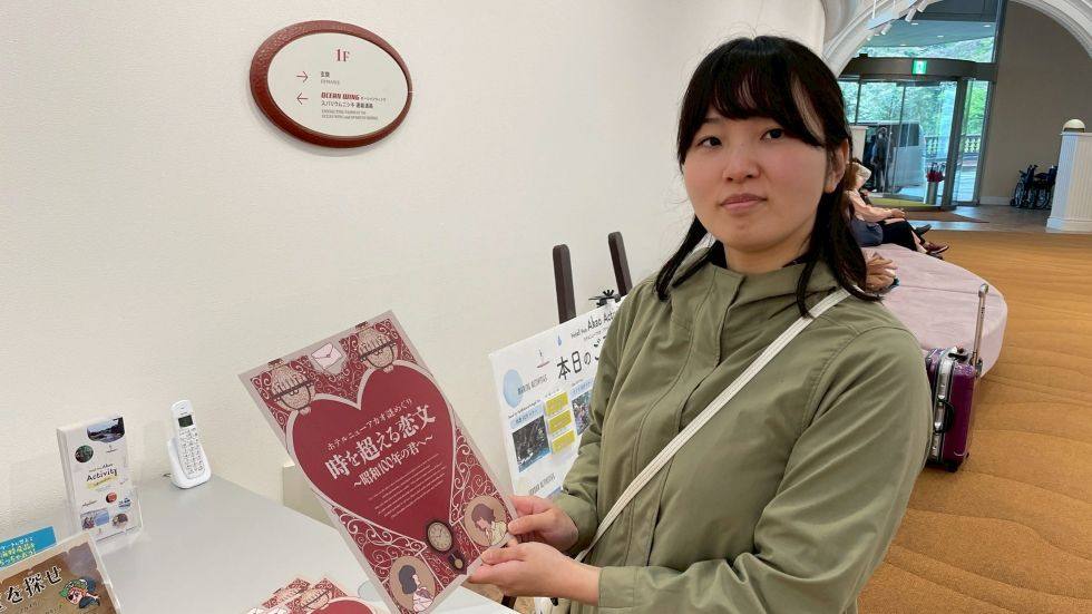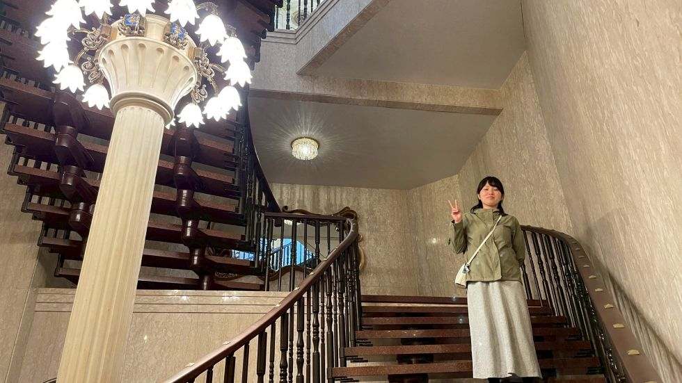 昭和レトロな雰囲気をそこかしこに残すオーシャン・ウイングで、レトロなフォトスポット探し。ゴージャスな螺旋階段で記念撮影。「以前はあまりゆっくり散策できなかったのですが、今回はレトロな雰囲気を存分に味わえました」。「昭和100年」キャンペーンを展開中のホテルニューアカオ。多くのゲストが館内のレトロスポットで撮影をしていたようです。