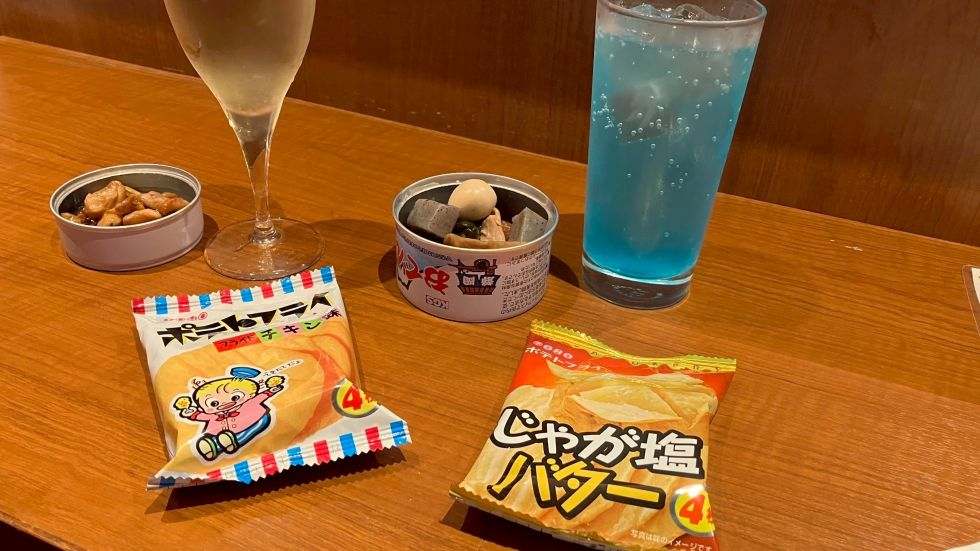 缶詰バーのカウンターで、懐かしい駄菓子も一緒に楽しんだ二人。「お酒の種類も豊富ですし、駄菓子もあって、もう言うことありませんね!」。
