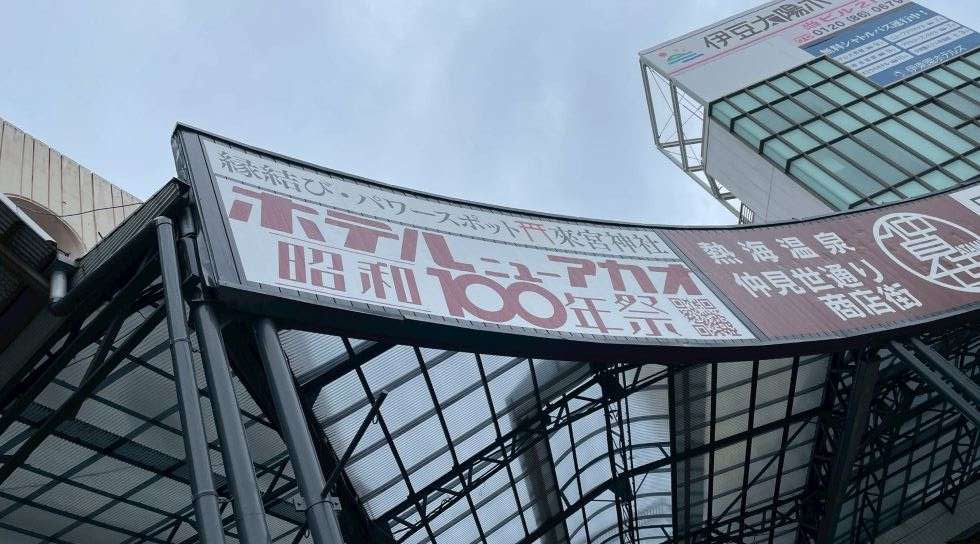 電車で熱海駅に到着した二人。まずは熱海駅前のアーケード街を散策…と思ったら、すぐに「ホテルニューアカオ 昭和100年祭」の看板が飛び込んできました。今年は昭和100年に当たるということで、昭和レトロを謳うホテルニューアカオでは1年を通していろいろなイベントを開催中です。熱海駅から発車するホテルの送迎バスで、さっそくホテルへ向かいましょう!