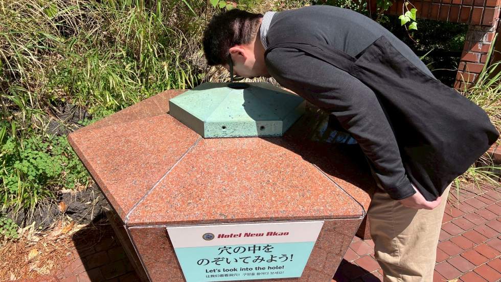 1日目は雨だったのであまり散歩ができなかった二人。2日目は出発まで存分に散策を楽しんだそうです。オーシャン・ウイングの散策路で見つけた、気になる穴。何が見えたのかはぜひ現地で!!