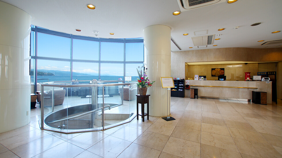 高い吹き抜けのロビーからは、一面に広がる海が眺められるように、スタッフが毎日磨いているのだとか。