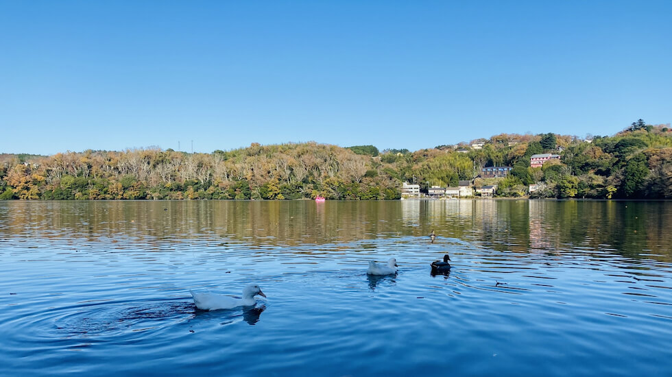 車で約10分の場所にある「一碧湖」。静かな湖面に映る木々の緑や、真っ青な空に白い雲を映し出す美しい湖です。一碧湖にはカフェやフットバスもありますよ。
