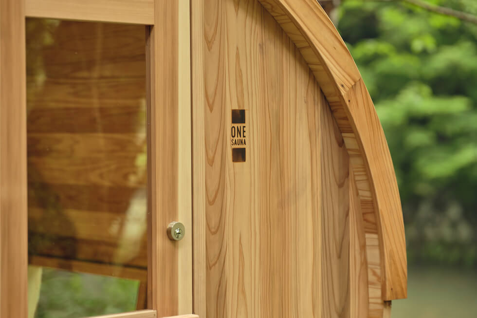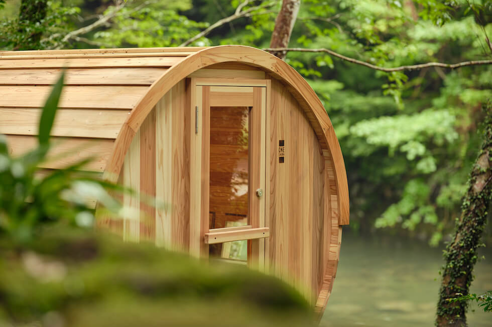 川沿いに佇むのは、鳥取県産の智頭杉で組み上げられたバレルサウナ。地産地消のサウナブランド「ONE SAUNA」のものです。自然を尊び、職人さんが一つひとつ手作りした一級品です。