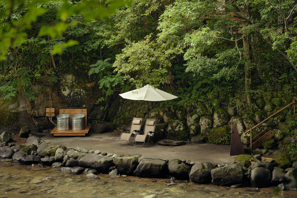 アウトドアやサウナ好きなら一度は体験してみたい、大自然の中でのサウナ。おちあいろうは、大浴場のサウナも人気ですが、宿の敷地内を流れる狩野川(かのがわ)の畔で楽しめる川辺のサウナもおすすめです。