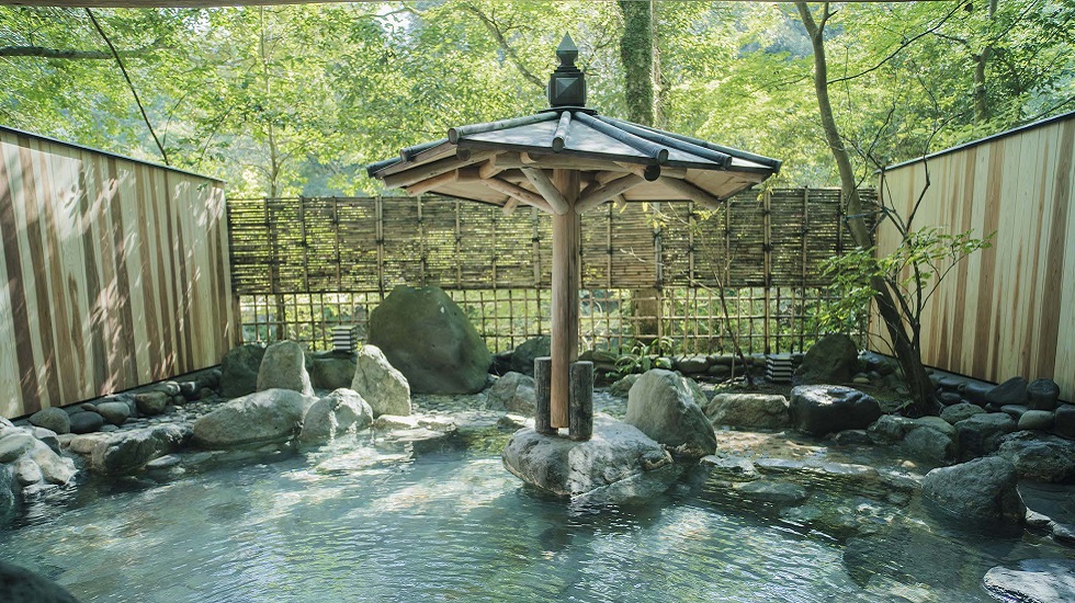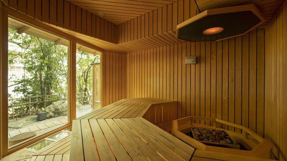 洞窟風呂・露天風呂・内風呂の3種類のお風呂に、ユニークな趣向を凝らしたサウナを設置。お風呂はすべて源泉掛け流しの温泉です。サウナは、狩野川を眺望する「天狗サウナ」に、茶室をモチーフにした「茶室サウナ」、川辺には「バレルサウナ」といった多彩なラインアップ。全てのサウナでロウリュができます。また環境に配慮し、紙パックのお水を用意しています。