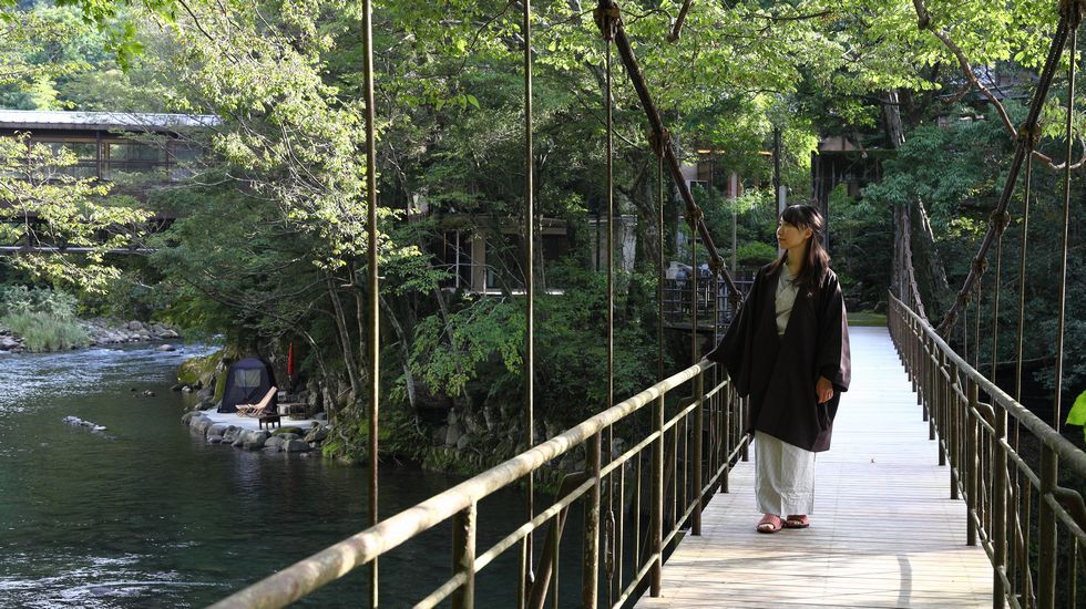 美しい自然の風景に囲まれた宿では、船着き場での読書や庭園散策をして過ごすのがおすすめ。庭園の先には、狩野川に架かる情緒あふれる吊り橋があります。橋の下の急流の音を聞きながら、少しだけ揺れるスリルが味わえる、宿泊者だけが渡れる吊り橋です。吊り橋の先には、緑の中でブランコを楽しめる広場があるので、ぜひがんばってトライしてみてくださいね。