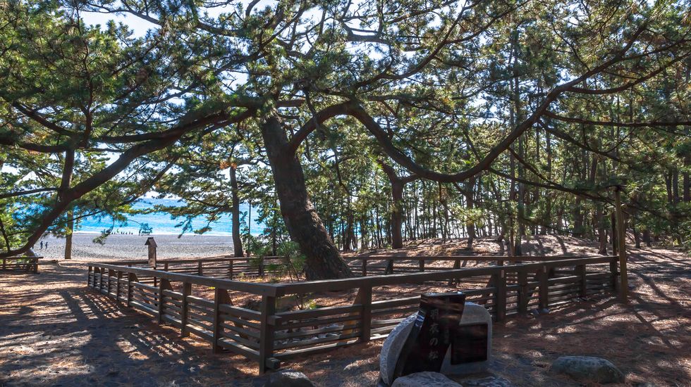 羽衣伝説に登場する天女が、自身の羽衣をかけたとして代々守られてきた「羽衣の松」。樹齢は推定300年、樹高14.5メートル、胸高直径は121センチにもおよぶ巨樹で、現在は3代目が根を張っています。2代目は樹齢650年を超えて弱ってしまい、初代は300年以上前の火山で海に沈んだと言われています。