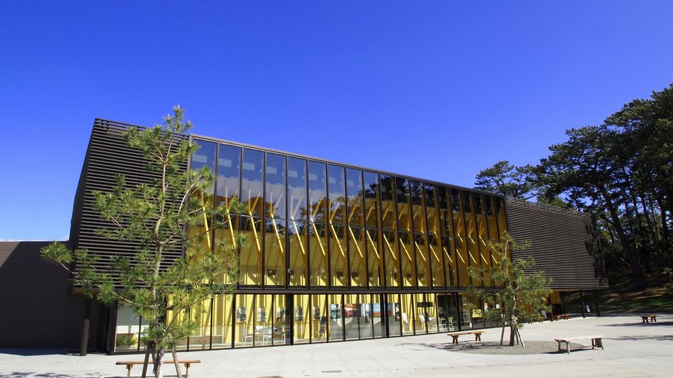 旅館の目の前には、三保松原の魅力を発信する施設「みほしるべ」も。現代的な外観ながら、縦長のガラスウォールに松林が映り込むことで、周囲の景観と融合しています。入口付近には休憩スペース「通り土間」のほか、松葉の匂いが香り立つ足湯(冬季の土日祝日のみ実施)が設置されているので、散策の合間にぜひ立ち寄ってみて。