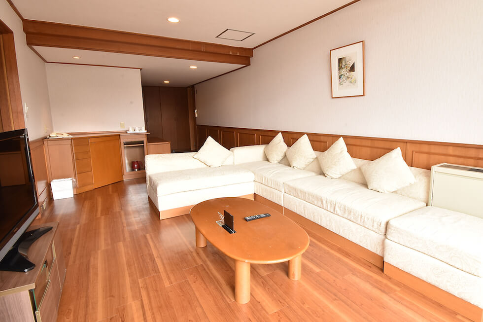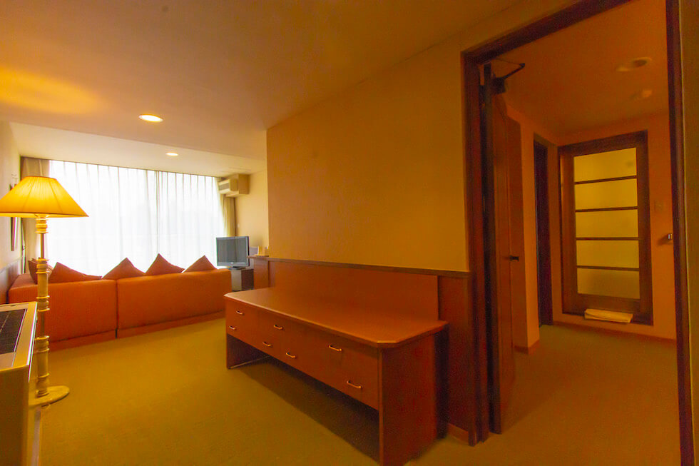 サウスウィングにある「デラックスツインルーム」は、広さ56平米のゆったりとした空間で、2名利用が基本です。広めのツインベッドを配したベッドルームとは別に、ソファを配したリビングルームも。