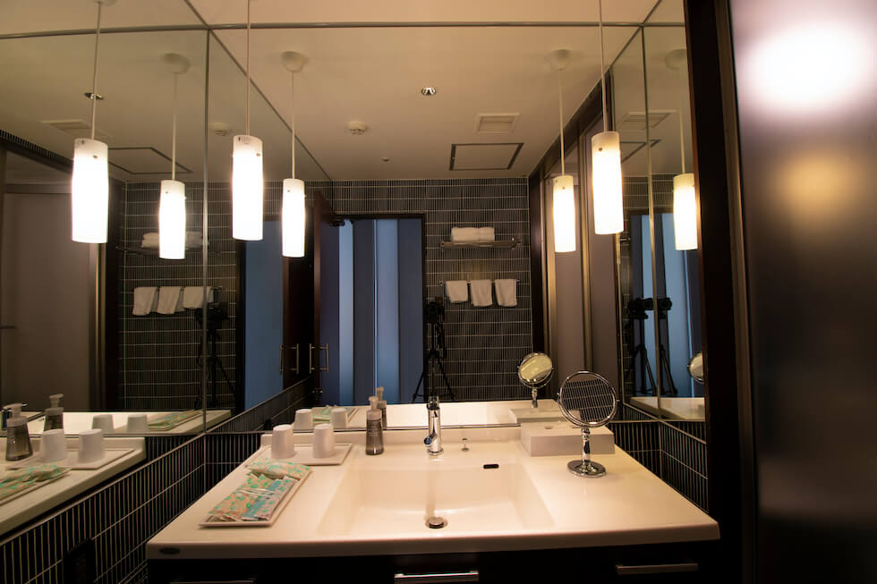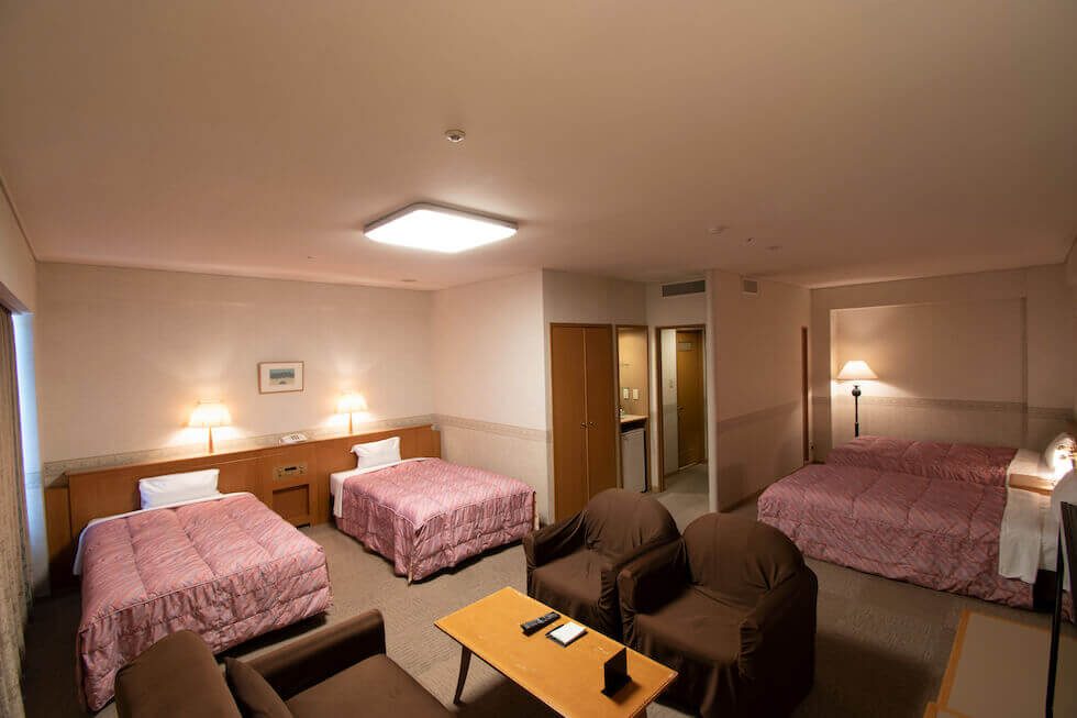 セミダブルベッド4台とソファーベッド1台を配した「デラックスルーム」。52.3平米の広さを誇り、最大5名まで宿泊可能。ファミリーやグループ利用にぴったりの客室です。バスルームはトイレとセパレートでダブルシンクの洗面台があり、使い勝手が良いのもうれしいポイント。身体の不自由な方でも安心なユニバーサルデザイントイレも一部に設置されています。