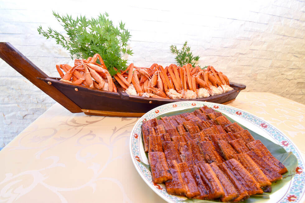 夕食のメニューにはカニやうなぎ、牛カットステーキなど豪華な食材もあり、静岡県の海産物も豊富に取り入れられています。人気のカニは食べ放題で、また浜松餃子や黒はんぺんなどの静岡名物も味わえます。うなぎは臭みがなく食べやすく、多くの人に好評なのだとか。