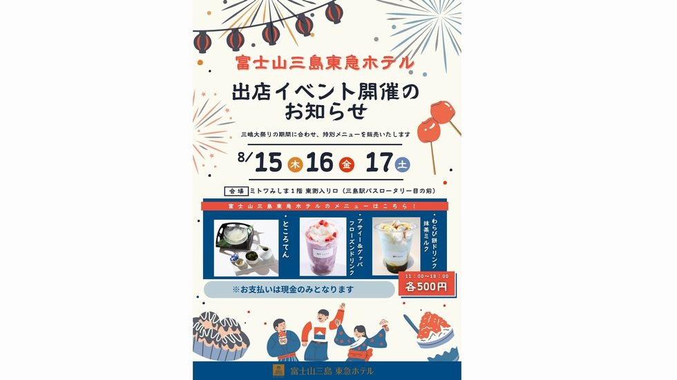 三嶋大祭り期間中は、ホテルの1階・2階に併設されている「ミトワみしま」で、イベントの開催もありますよ。1階の東側入口で出店が並びます。富士山三島東急ホテルから「ところてん」、「アサイー&グァバ フローズンドリンク」、「わらび餅ドリンク 抹茶ミルク」の提供を予定。期間中も猛暑が予想されるので、ぜひ立ち寄って、涼んでくださいね。