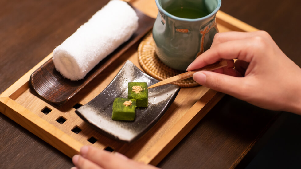緑と花に囲まれた長いアプローチをゆっくり歩いて、天井が高く明るいエントランスに到着。館内の和モダンな雰囲気が、隠れ家の落ち着きと開放感を両立しています。チェックインは、個室でわらび餅と緑茶をいただきながらマイペースに進められると好評です。