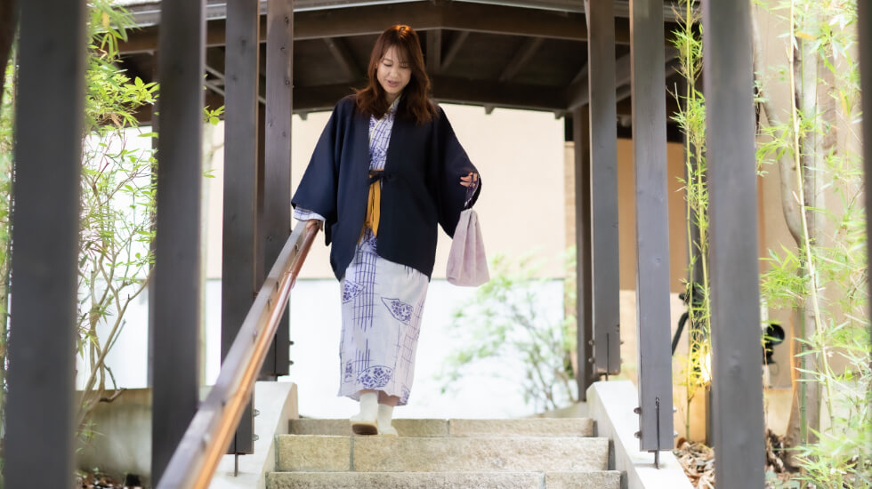竹林に囲まれたノスタルジックな回廊を経て、離れに続く約50段の階段。ここで表現されているのは、オーナーが旅館経営前に体感した温泉地の空気感です。温泉に入るために宿から階段を上って向かう道すがらだったそう。その時の高揚感が伝わってきそうです。