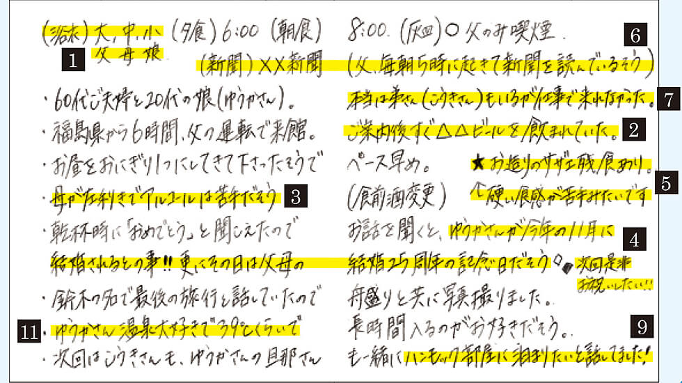 毎回丁寧に記載される顧客カルテは、なんと23年以上ものデータが保存されています。一人ひとりの宿泊客に合わせた温かいおもてなしが受け継がれているんですね。
