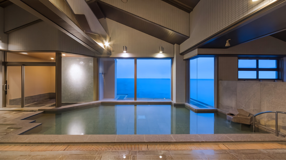 ひとつ目は、館内で最も大きな温泉エリアである「望洋大浴場」。海との間に遮るものがなく、見渡す限りの大海原が目の前に広がります。広々とした露天風呂はもちろん、寝湯、立湯、石風呂、内風呂、サウナも堪能できる大浴場です。