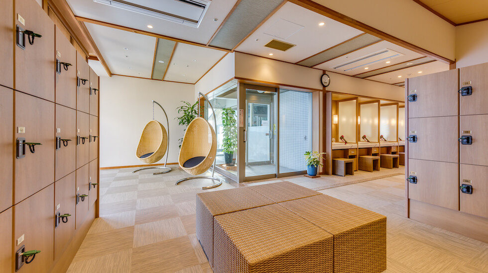 2022年12月よりリニューアルした脱衣所。下駄箱は個別に靴をしまえるようになったため、他の人のスリッパを履き違える心配もないですよ。