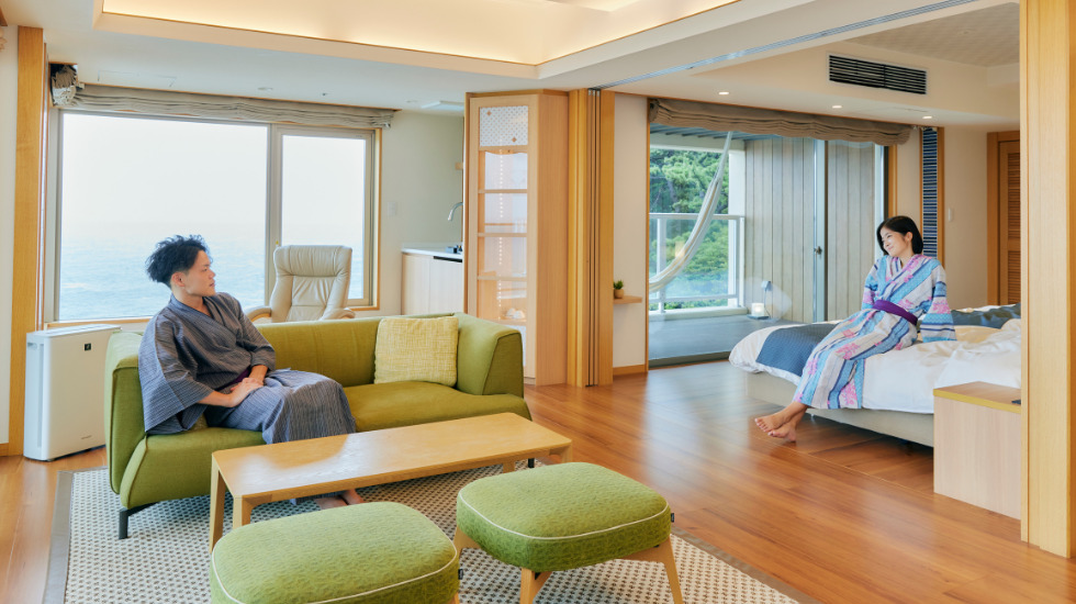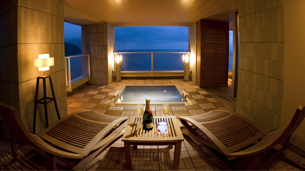 カップルや夫婦での特別な旅行には、露天風呂付ラグジュアリースイートの客室がおすすめ。素敵な景色の中で優雅なプライベート時間を過ごしましょう。