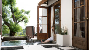 「コルテラルゴ伊豆高原」は、伊豆高原の高台にたたずむ全6室のリゾートホテルです。バリ島や地中海、サンタフェなど世界の有名リゾートをイメージした客室は、すべて天然温泉の個室露天風呂付き。白を基調としたプロヴァンス風の外観と輸入家具が彩る館内で、伊豆の素材を活かしたフレンチイタリアンのフルコースも堪能できます。静寂の中で非日常の癒し時間を心ゆくまで過ごせる宿です。