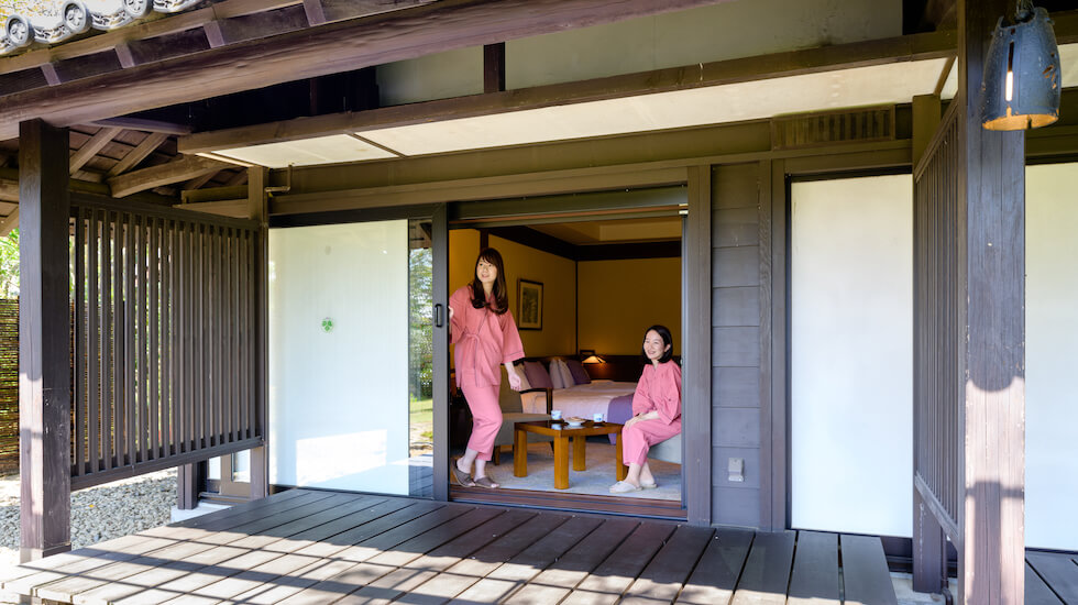 大人の女子旅におすすめの客室は、洋室タイプの「藤殿」。ガーデン側には藤棚がついており、春には藤の花が咲き乱れます。