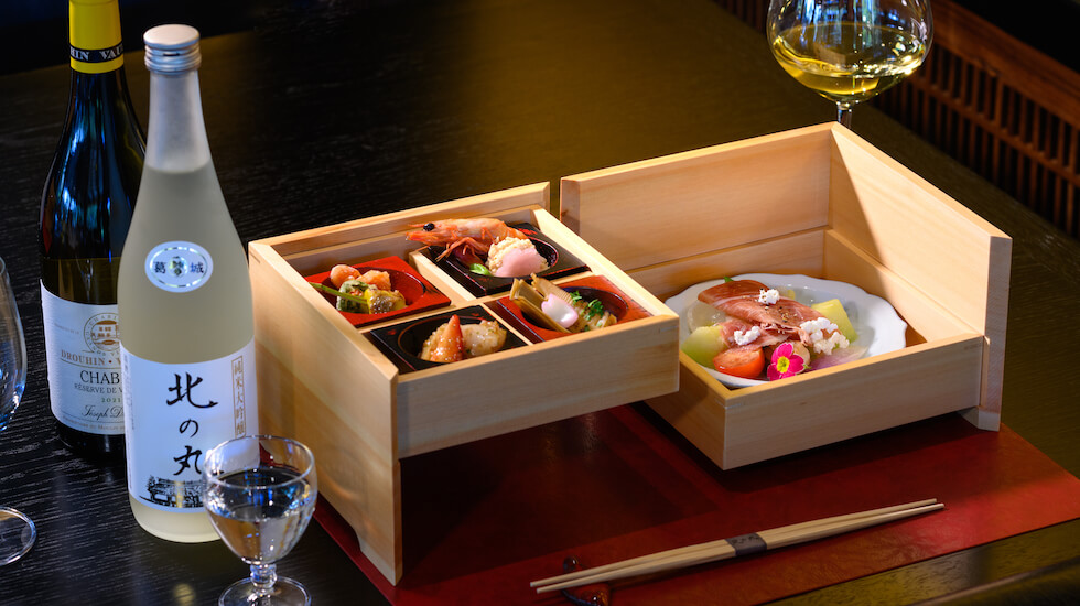 和風空間で味わうのは、地元食材をふんだんに使った和魂洋才の会席料理。ソムリエが選ぶワインなどとのマリアージュもぜひ。