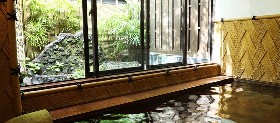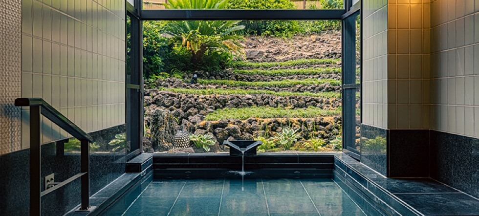 本館にある大浴場と中浴場。大浴場は露天風呂と内風呂、貸切サウナがあります。内風呂は広々としているので、足を伸ばしてゆっくりと入浴しましょう。内風呂と貸切サウナの中浴場は、石造りの小庭を望む浴場で2人〜3人が入るのにちょうどいい大きさ。プライベート感も楽しめます。男女入れ替え制なので、ぜひそれぞれの浴場を堪能して。また、どちらの浴場にもシャンプーバーが充実。種類も豊富です。さらに一人専用の貸切サウナは空いていれば利用OKなので、ととのう体験もできますよ。