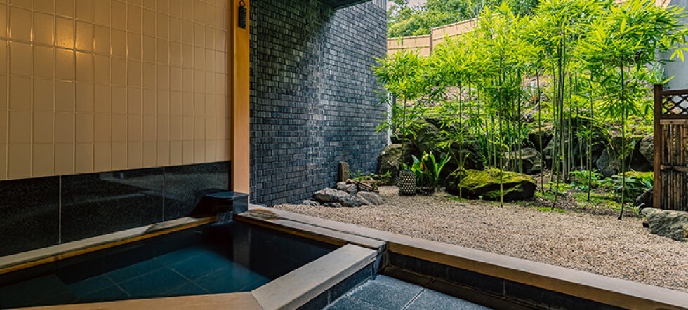 露天風呂は大浴場にひとつと、本館にある貸切露天風呂で入ることができます。大浴場の露天風呂は、竹林の下にあり、ホッと一息つけるくつろぎの空間。森の中にある宿なので、爽やかな木々の香りを感じながらの温泉タイムになりますよ。貸切露天風呂は、それぞれに特徴が。一人で楽しみたい場合は壷風呂を楽しめる葵がおすすめです。また、別館にも半露天風呂があります。美しい小庭に面しており、優雅な印象。本館の貸切露天風呂とは異なる雰囲気での入浴ができますよ。