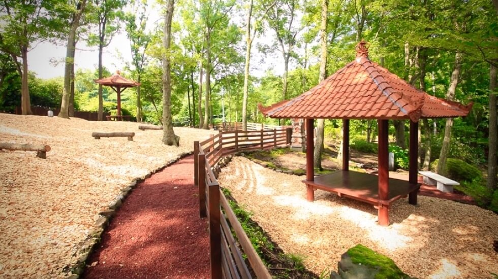ウブドの森 伊豆高原には、ドッグランが全4カ所。本館と別館に屋内・屋外のドッグランがあります。屋外ドッグランは森の中の雰囲気。高低差があるアンジュレーションにウッドチップも敷き詰めてあり、思い切り遊べるようになっています。飼い主さんは、バリの象徴とも言われるガゼボがあるので、わんちゃんも見守りながらのんびりと過ごすのにぴったりです。屋内ドッグランもクッション性のある床材を使用したフローリング仕様。ルームランナーにフォトスポットもあり、飼い主さんも楽しめますよ。ドッグランの周辺には足洗い場と水飲み場、マナーボトル、足拭きタオルなどの設置があるので安心です。