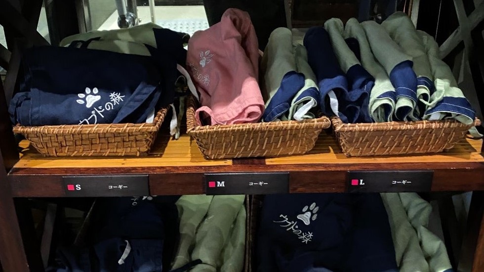 わんちゃんのケア用品を含め、様々なグッズが手に取りやすいようになっているウブドの森 伊豆高原。エントランスなどにはわんちゃん用の紙おむつや作務衣がサイズ豊富に置いてあります。飼い主さん用の作務衣が客室にあるので、館内でペアコーデが実現。紙おむつはベッドで一緒に寝る際に便利です。そのほか、雨の日にうれしいわんちゃん用のレインコートやお散歩時に必要なエチケット袋などもレンタルスペースにそろっています。また、めずらしいのはヨガマット。専用のQRコードを読み込むとセルフでできる愛犬ヨガの動画を視聴できるので、身体を動かしたいときなどにおすすめです。