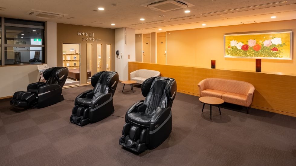 新館のフリースペースにはマッサージチェアが3台。自由に使えるので、ゲストに人気のスペースです。ライブラリーの本を読みながらマッサージをするのも可能です。