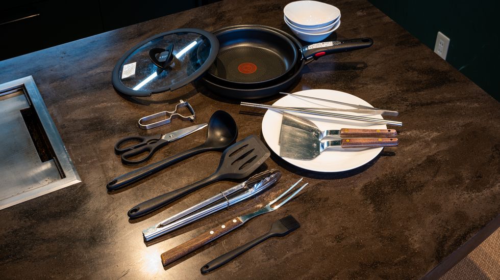 キッチンには調理器具も揃っています。鍋や食器はもちろん、なんとグリルで使えるたこ焼き用の鉄板まで。