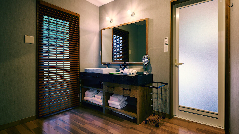 洗面所には、コットン・ヘアゴム・ボディタオルなど必要なアメニティーがそろっているのはもちろん、ドライヤーにヘアアイロンまで完備。シャンプー&コンディショナーのバスアメニティとスキンケア類は、宿オリジナルブランドの「余香(YOKOU)」シリーズ。熱海の海をイメージした香り「リッチブルー」が心地よく髪に残ります。宿を出たあともふと感じる余香の香りに、楽しい宿での思い出が呼び覚まされそう。