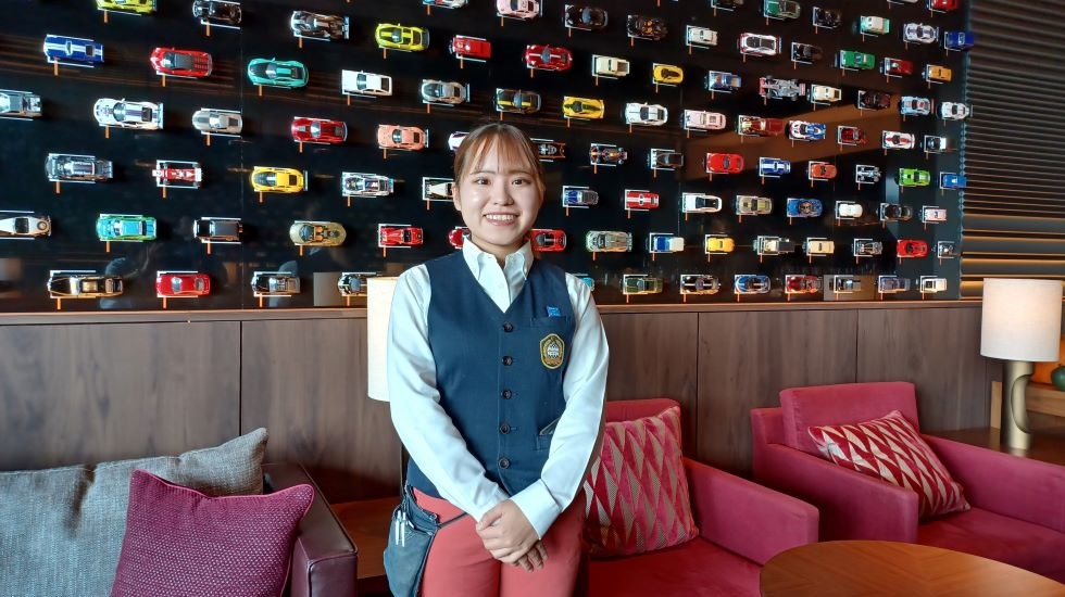 「TROFEO ラウンジ」や「BAR 4563」でゲストにサービスを行っている青木さん。2022年の開業当初からのスタッフさんです。青木さんの後ろにはBAR 4563にある壁一面のクルマのオブジェ。そんな車好きならずとも気分が上がる空間で、推しポイントをうかがってみました。