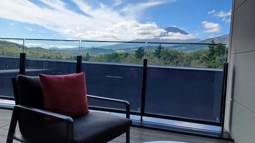 「実はあまり使われないんです」と言って紹介してくれたのは、BAR 4563のテラス席。ゆったりとした空間には2組のゲストが座れるテーブル&チェアが。営業開始が18時~なので、日の入りが遅い夏の時期などにおすすめ。富士山を眺めながら頬に当たる風を感じるのは気持ちいいでしょうね。