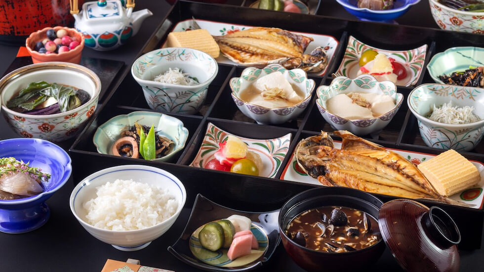 朝食(釜揚げしらす、卵焼き、ソーセージ、ハッシュドポテト、カボチャ煮もの、ワッフル、御飯、豆腐お味噌汁、フルーツヨーグルト)
