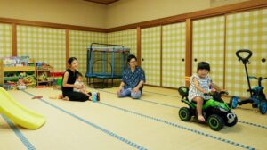 お菓子やドリンクのサービスやおむつやベビー・キッズ用品の貸し出しなど、サービスが充実!「河津七滝温泉 水鞠」は家族連れ大歓迎の宿。客室内にも子ども用の布団、アメニティなども設置してあります。