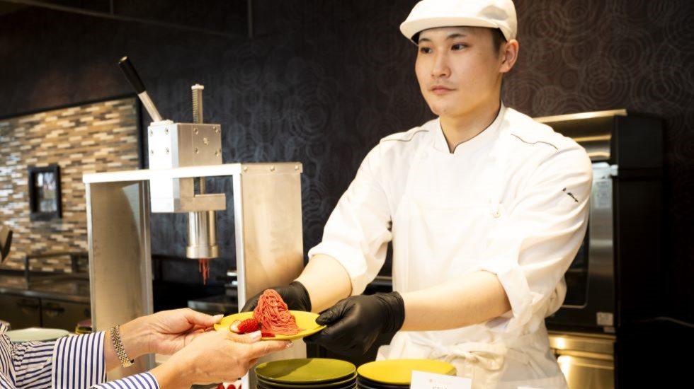 目の前で調理スタッフが絞り出すイチゴのモンブランは、子どもも大人も笑みがこぼれるひと皿。下にはワッフルが隠れていて、ボリュームたっぷり。夕食ビュッフェ時に楽しめます。