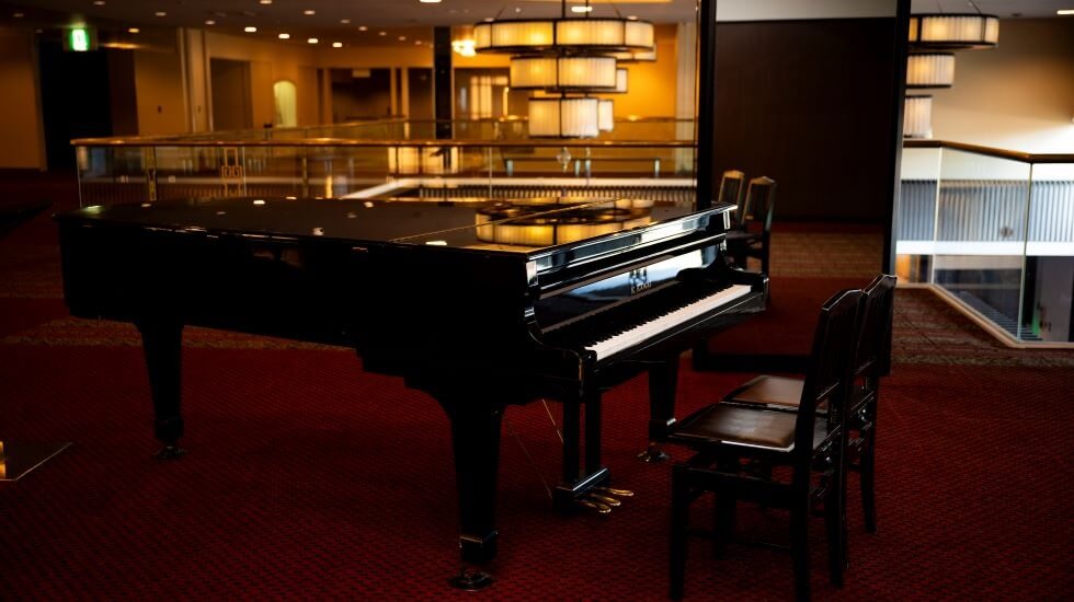 カワイ・ヤマハ・ローランドといった楽器メーカーが施設を構える音楽のまち、浜松。ホテル2階にはグランドピアノがあり、誰でも自由に触ってみることができます。
