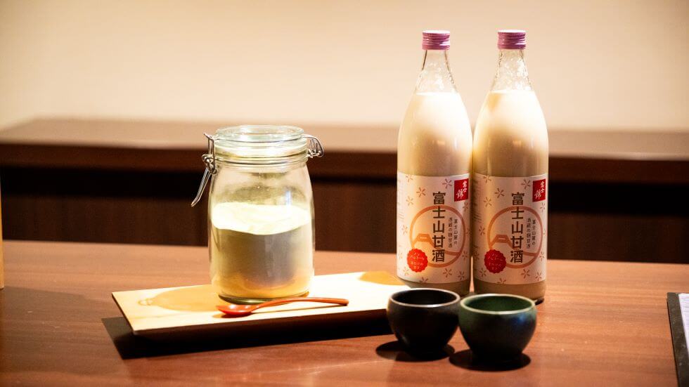 温泉の営業時間中に常時提供されているのは、静岡の老舗茶商「竹茗堂」のウス茶糖。お茶にグラニュー糖やシナモンなどをミックスしたもので、甘いながらもすっきりとした地元民には馴染み深い味わいです。また、15時以降はりんご酢マンゴーなどのビネガードリンク、20時以降は温かな甘酒も提供。甘酒は富士山の麓にある「富士錦酒造」が手掛ける「富士山甘酒」です。ほんのり温かな甘酒をスタッフが注いでくれます。