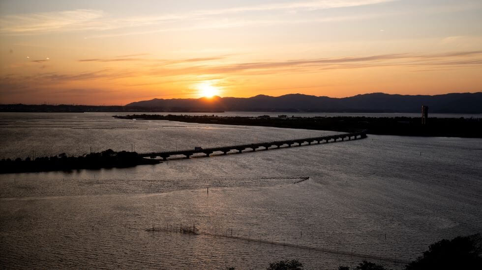 13階の展望室からは、見事な夕焼けが見える日も。刻々と暮れゆく時間を、ゆったりとした展望室で楽しんでくださいね。浜名湖にかかる橋も印象的な風景に一役買っています。