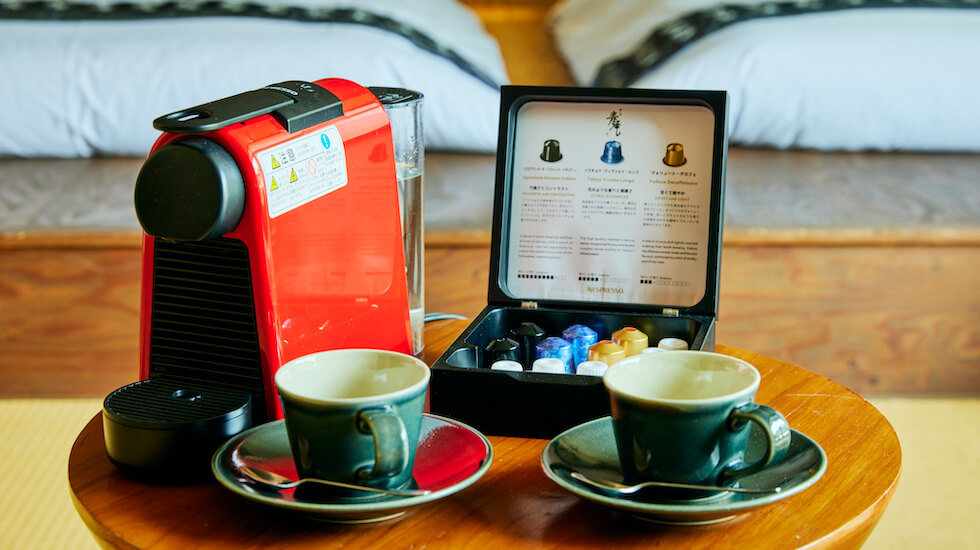 露天風呂付き客室にだけ特別に置かれている、コーヒーメーカー。広い空間で好きな時間にゆったり淹れたてのコーヒーが楽しめますよ。