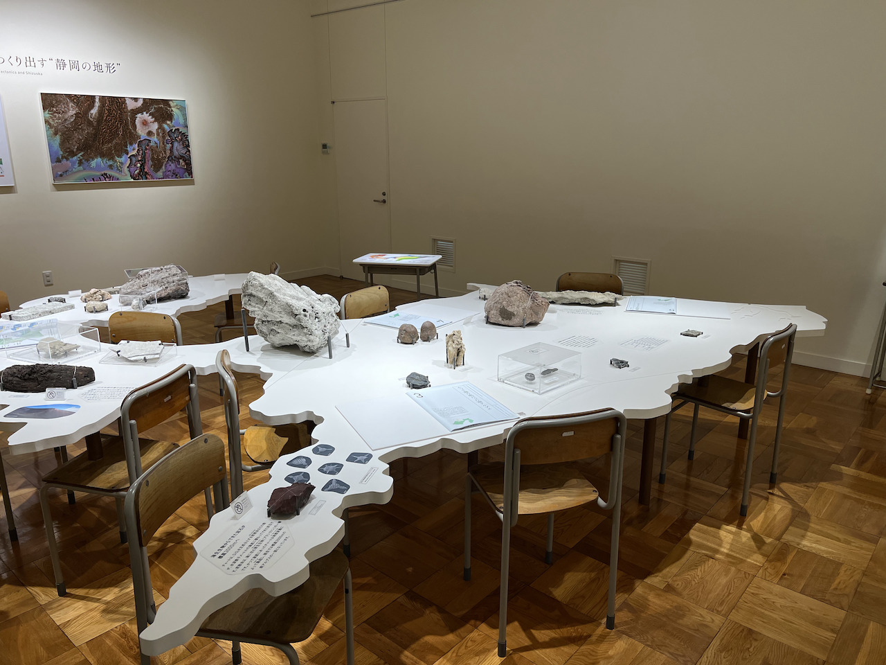 学習机が取り囲む静岡県を型どったテーブルには岩石・化石が展示され、大地の成り立ちについて学べます。